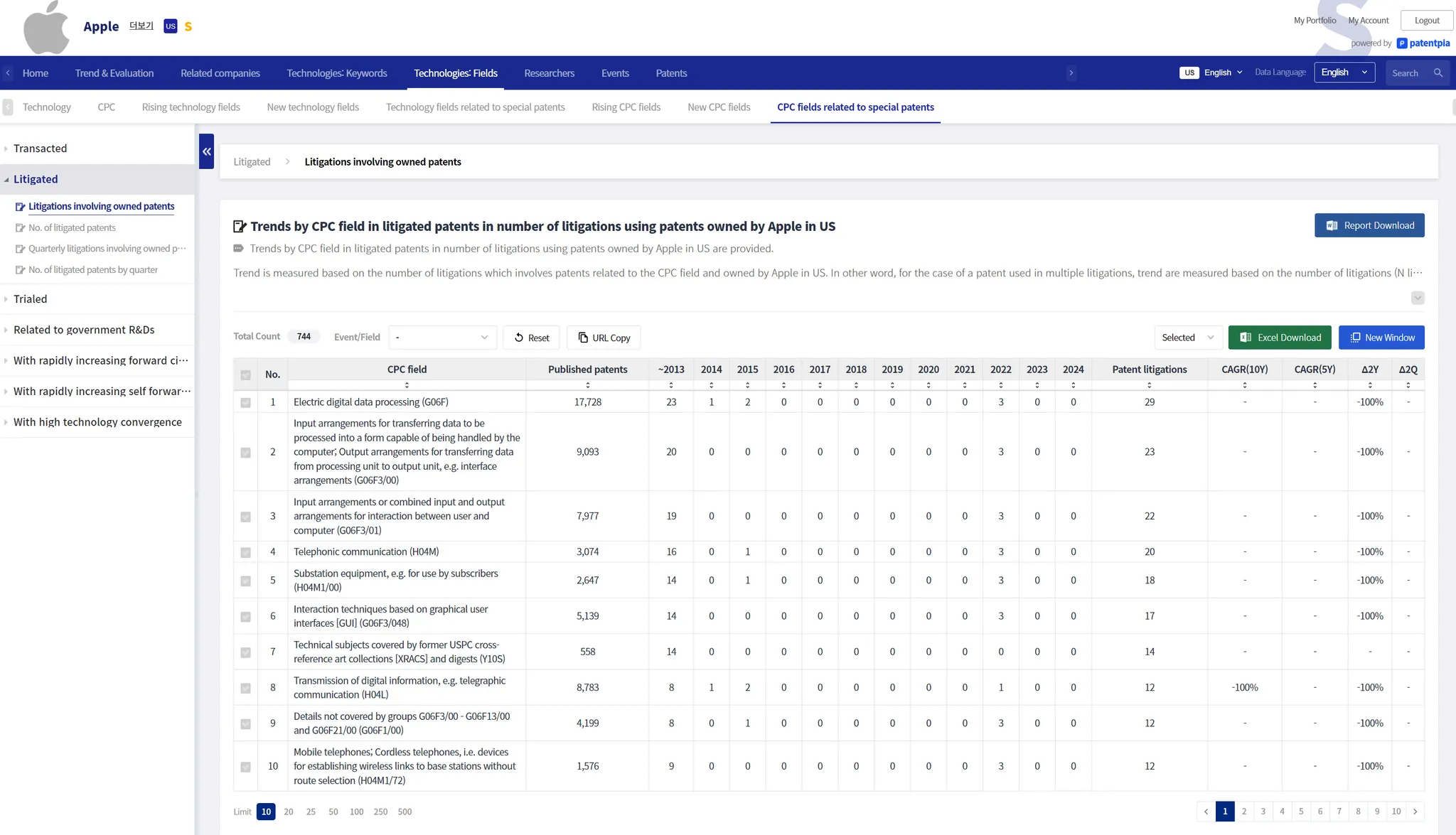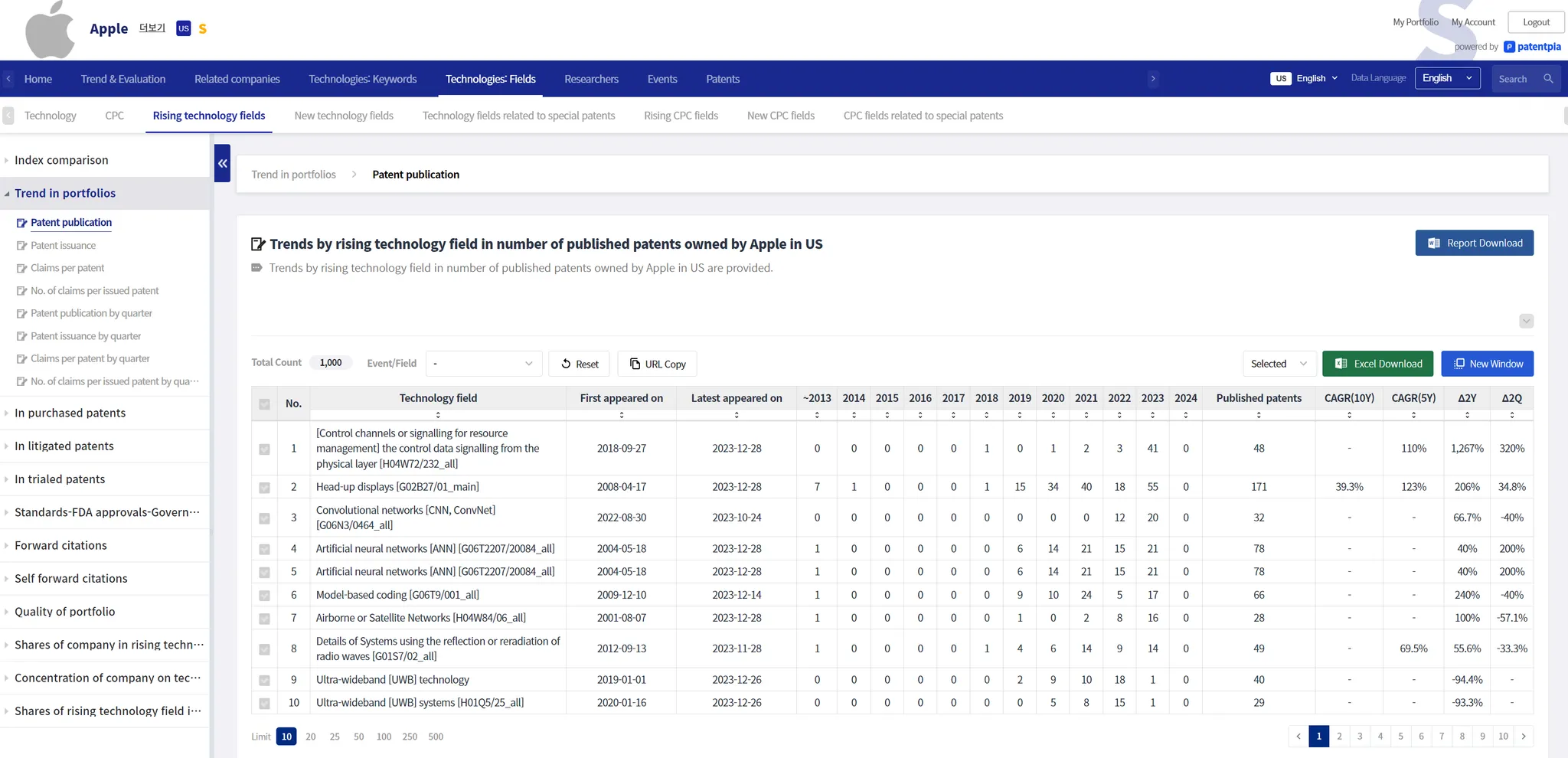 Global companies like Apple or companies with large numbers of patents in possession rarely have new appearing fields, but the new appearing fields that do occur in these giants are important information.