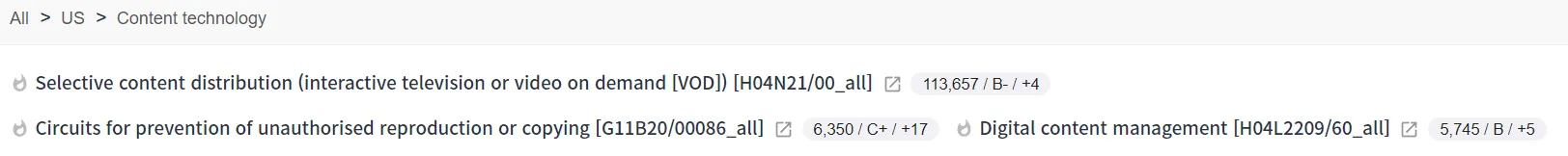 Technology classifications in the upper depths often have CPCs gathered from multiple places (hierarchy tree path). For example, the "Content technology" technology classification node is composed of 3 sub-technology classifications (CPC H04N21/00, CPC G11B20/00086, CPC H04L2209/60). Here, the three lower technology classifications have the same hierarchy tree path (parent classification is the same, one is in section G (code starts with G), two start with H. The two that start with H are also different, H04N and H04L, respectively).