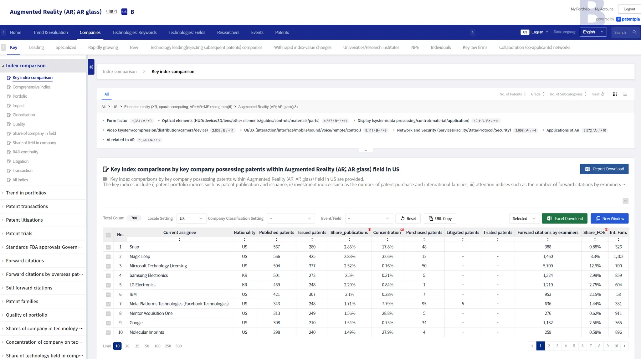 Below is an example of company analysis contents for a technical field item called "Augmented reailty". The companies in the analysis are right holders of patents for "Augmented reailty." You can analyze comparisons between right holders of patents. The types of comparative analysis are: i) index comparison, ii) trend comparison, iii) forward citations comparison, iv) patent families comparison, v) quality comparison, vi) comparison by kind of events, vii) share comparison, and viii) concentration comparison.