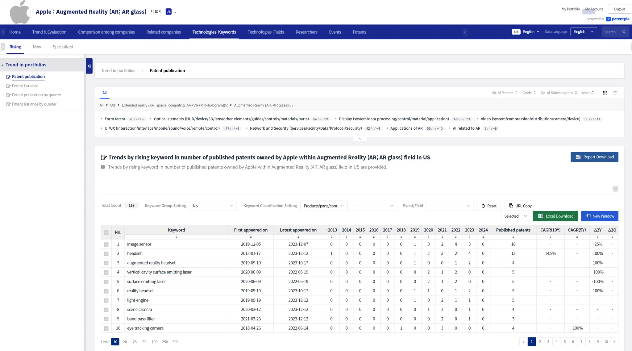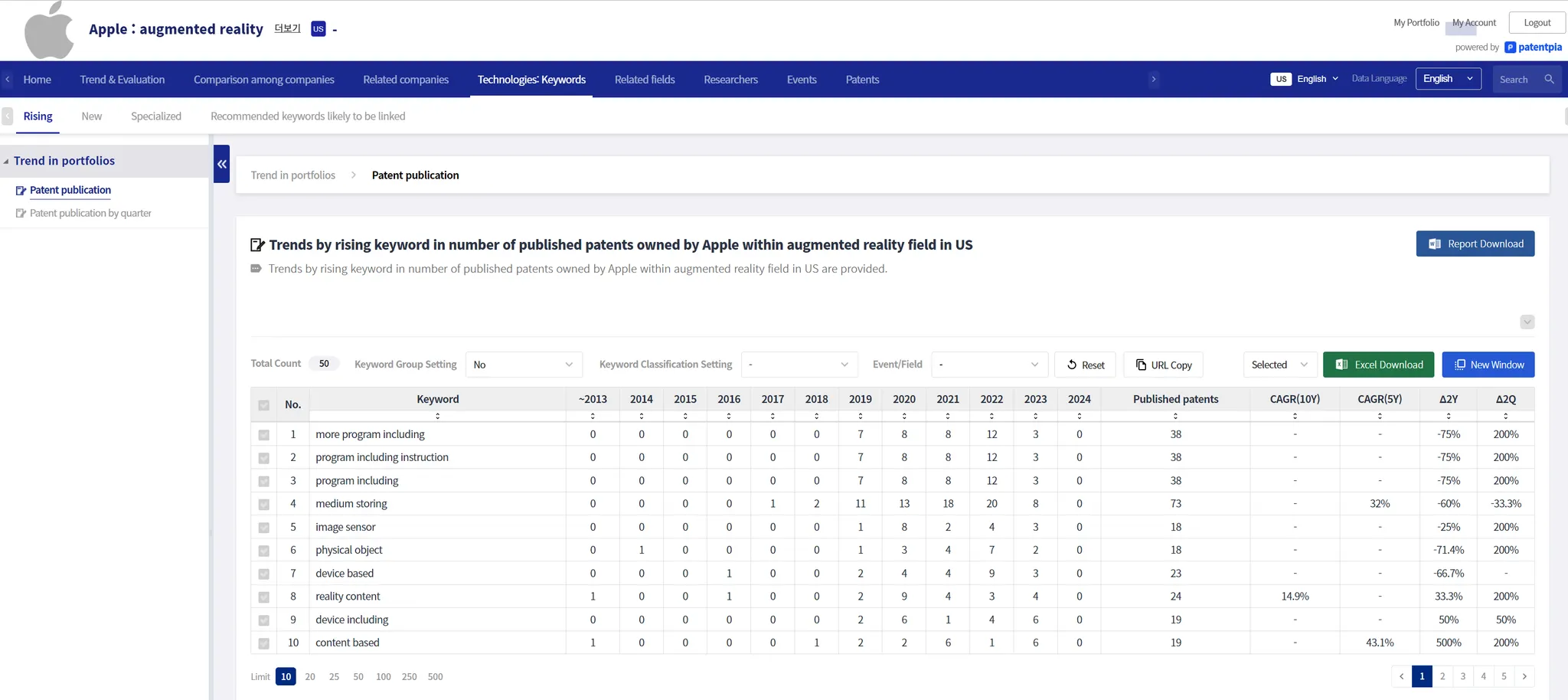 Below is an example of the analysis contents of the company "Apple" for the technical field item "Augmented reailty". Rising keywords in the analysis below are those included in the patents related to field "Augmented reailty" of company "Apple".