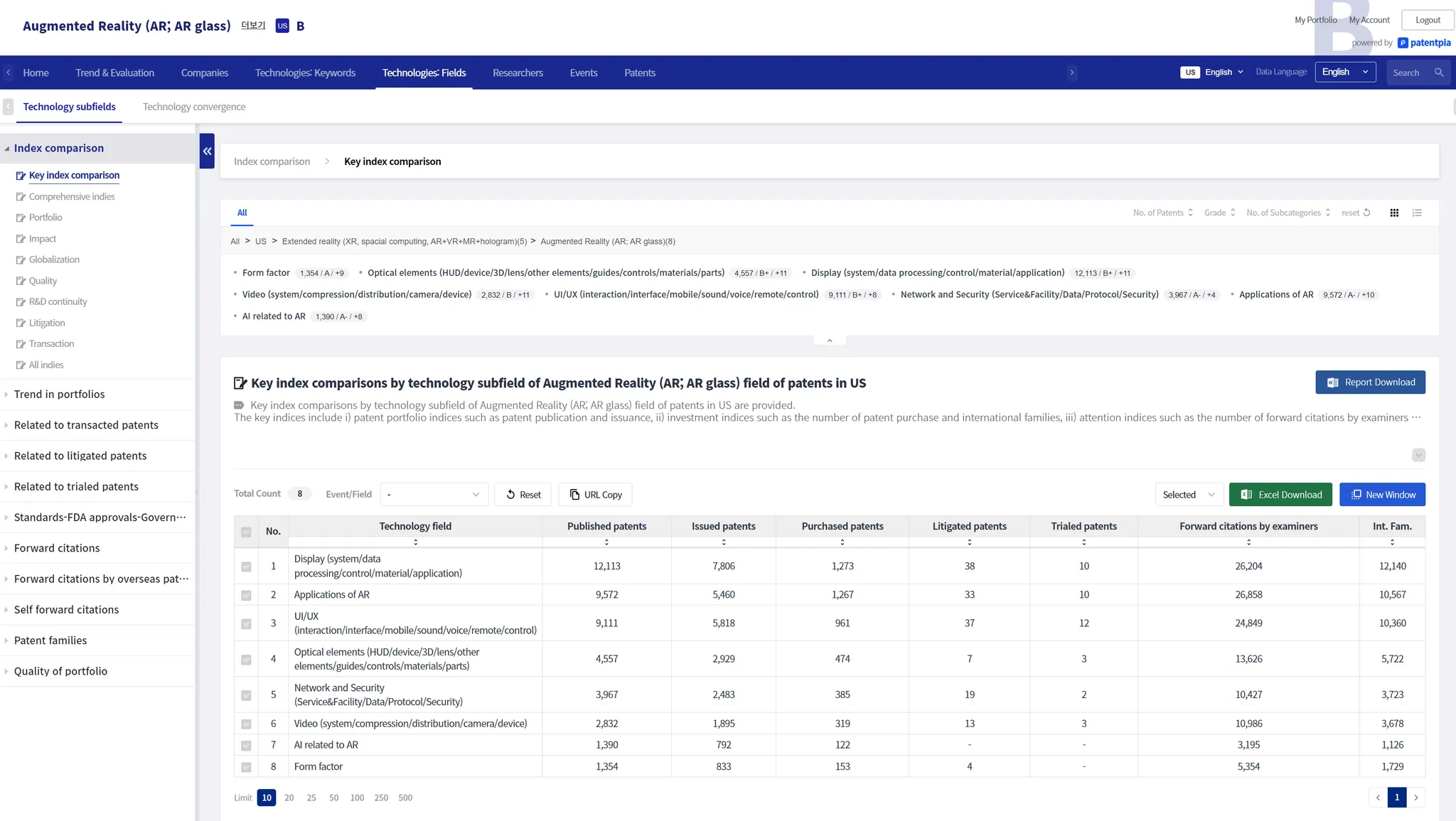 The analysis contents for index comparison between fields belonging to multiple field groups include i) index, ii) patent portfolio, iii) impact, iv) fidelity, v) quality of patents, and vi) events.