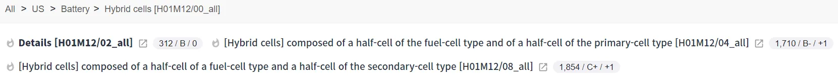 Meanwhile, the “Hybrid cells" technology classification nodes all have the same hierarchy tree path.
