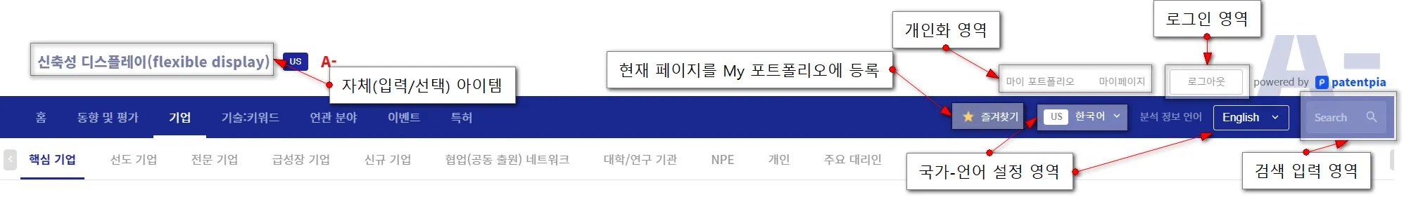 GoldenCompass의 최상단 영역에는, i) 로그인 영역, ii) 개인화 영역, iii) 국가-언어 설정 영역, iv) 검색 입력 영역 등 4가지 핵심 요소가 있습니다.