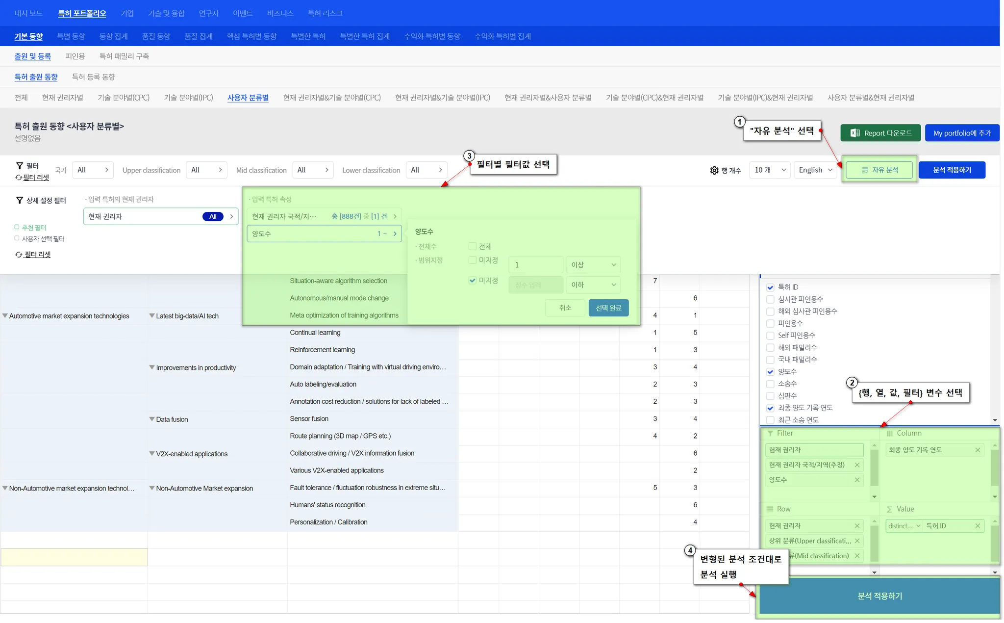 만약, 데이터에 중간 분류(mid classification) 및 하위 분류가 존재하고, 현재 권리자별로 매입 연도별 매입 특허 동향을 분석해야 한다면, “자유 분석” 버튼을 클릭한 다음, {행, 열, 값, 필터} 설정 영역에서 다음과 같이 처리합니다.
